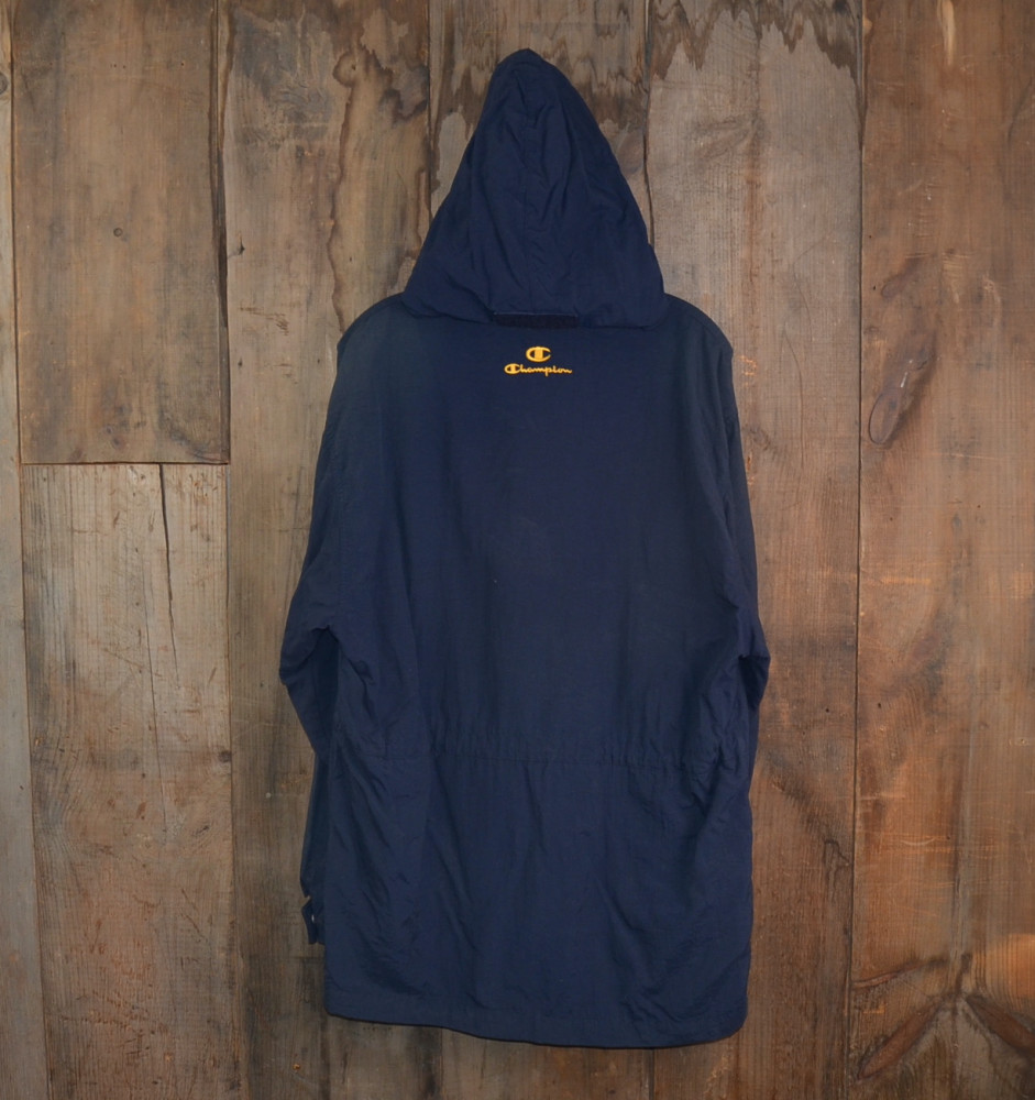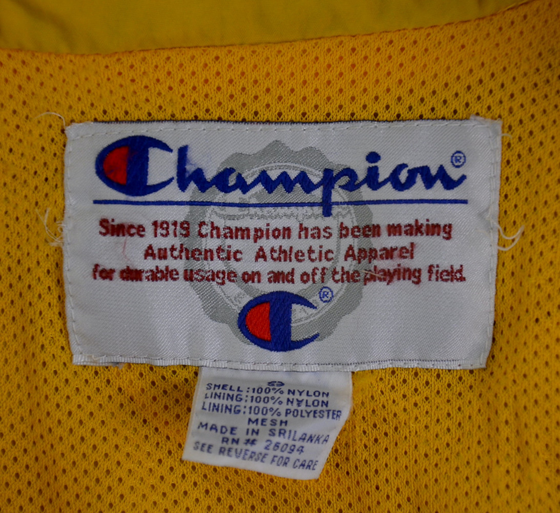 Navy Blue shell lined with yellow mesh made as UC Berkley apparel. With breathable mesh, it’s a great jacket to throw on before or after a workout. The jacket is missing the zipper on the right-side pocket and there’s a thread pulling on the “Cal” logo. There’s also slight discoloration on the back that I tried to get a picture of, but it’s so faint that it would only show up on camera while the flash is on. This made the color of the jacket look weird and washed out in the close up pictures, but in reality it’s a very nice deep navy blue.
