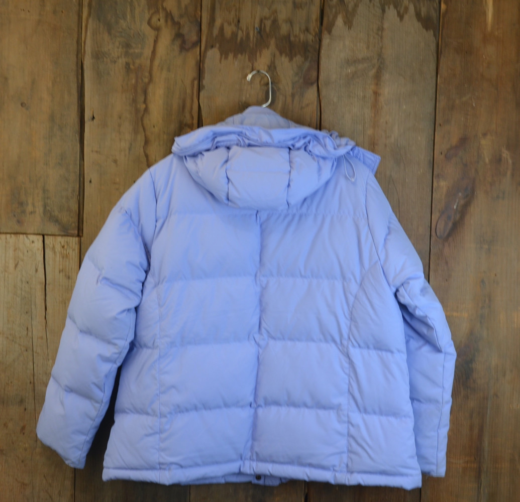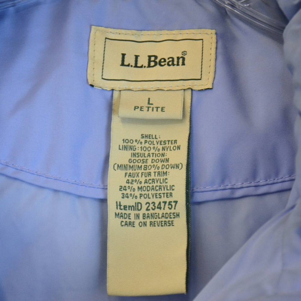 L.L Beans “Ultrawarm Jacket” is lined with a water-repellent and stain-resistant polyester poplin shell and filled with premium down, making a very well insulated and soft winter jacket. It falls at the hip, has snap closure over the zipper for extra weather protection and is sold on the website for $189. The jacket in this baby blue color is part of a limited edition collection and is no longer sold. The jacket typically has a removable faux-fur trim on the hood, but this one doesn’t come with the trim. It has barely been worn and the only flaw is a minor stain on the lower left side; however, it’s so faint that it wouldn’t show up in the pictures. Size women’s petite-large.