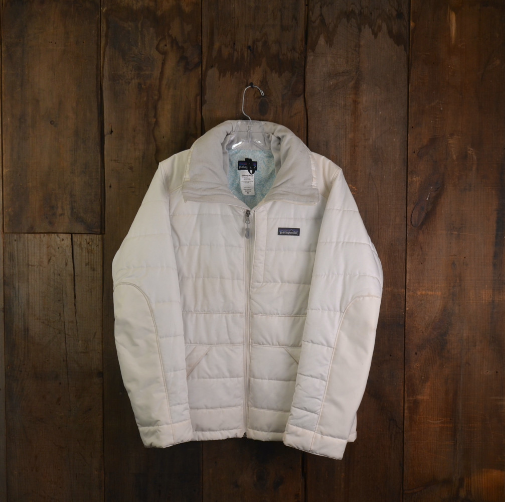 Lightweight Patagonia puffer jacket with a soft baby blue fleece lining. The shell is a slightly off-white/cream-ish color. The jacket is lightly worn.
